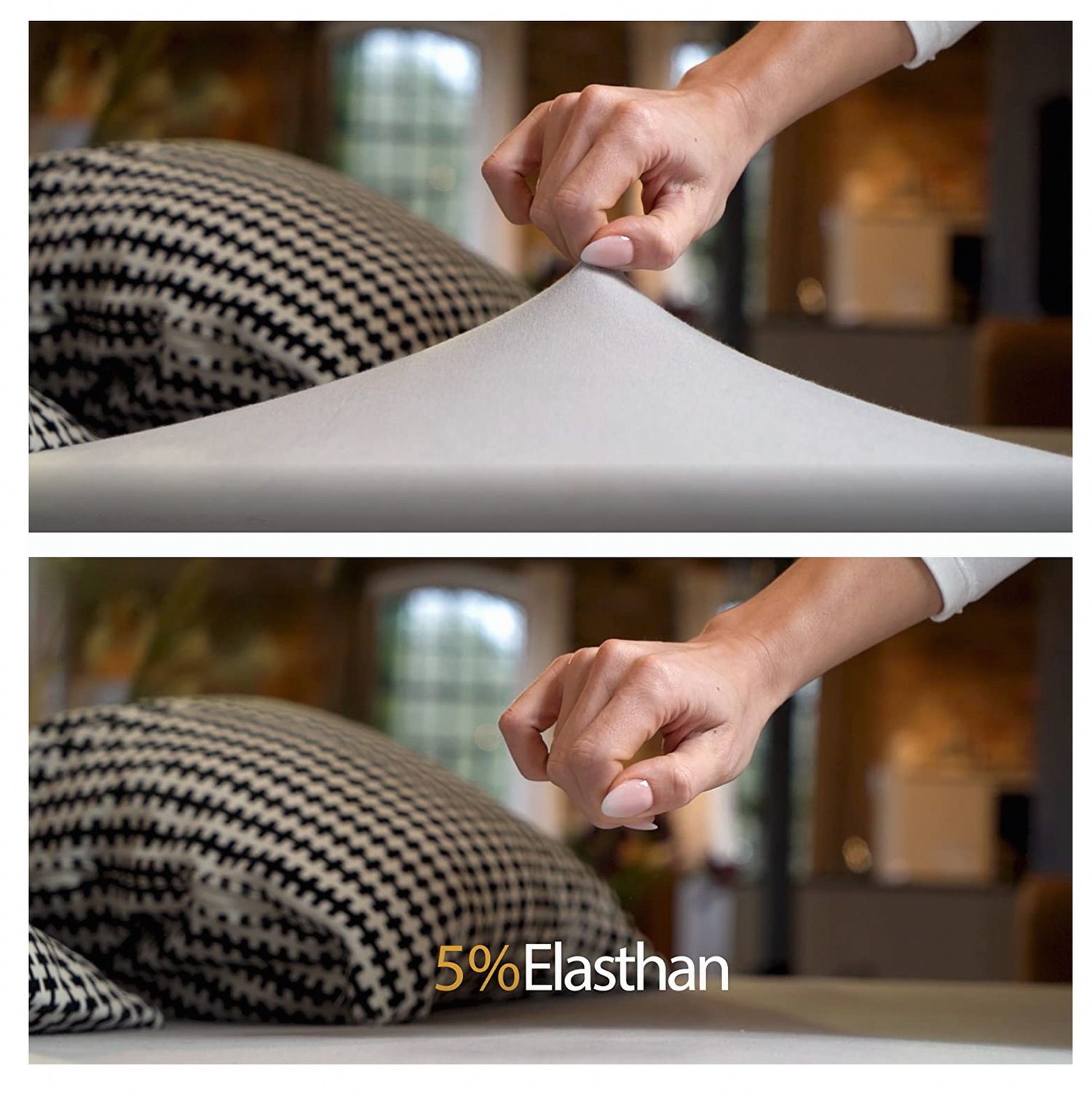 Das schwere, blickdichte Jersey Material besteht zu 95% aus gekämmter, atmungsaktiver Baumwolle. Durch den 5%igen Elasthan Anteil ist das Leintuch so elastisch und passt sogar auf Matratzen mit 220 cm Überlänge.